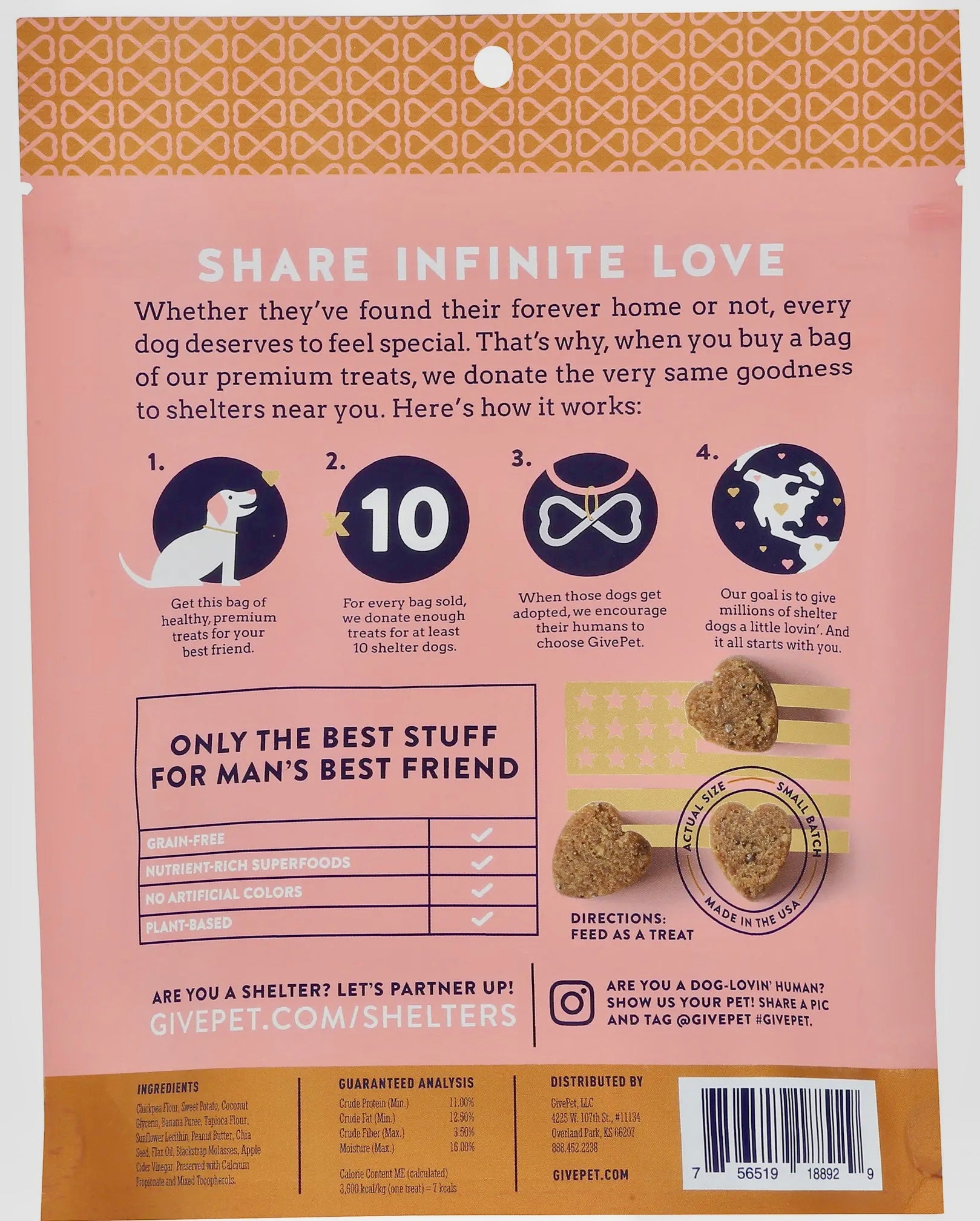 - Your Purchase Shares the Love: For every bag of grain-free, healthy, premium dog treats you buy, GivePet donates enough treats for at least ten shelter dogs, helping give millions of shelter dogs a little lovin’.